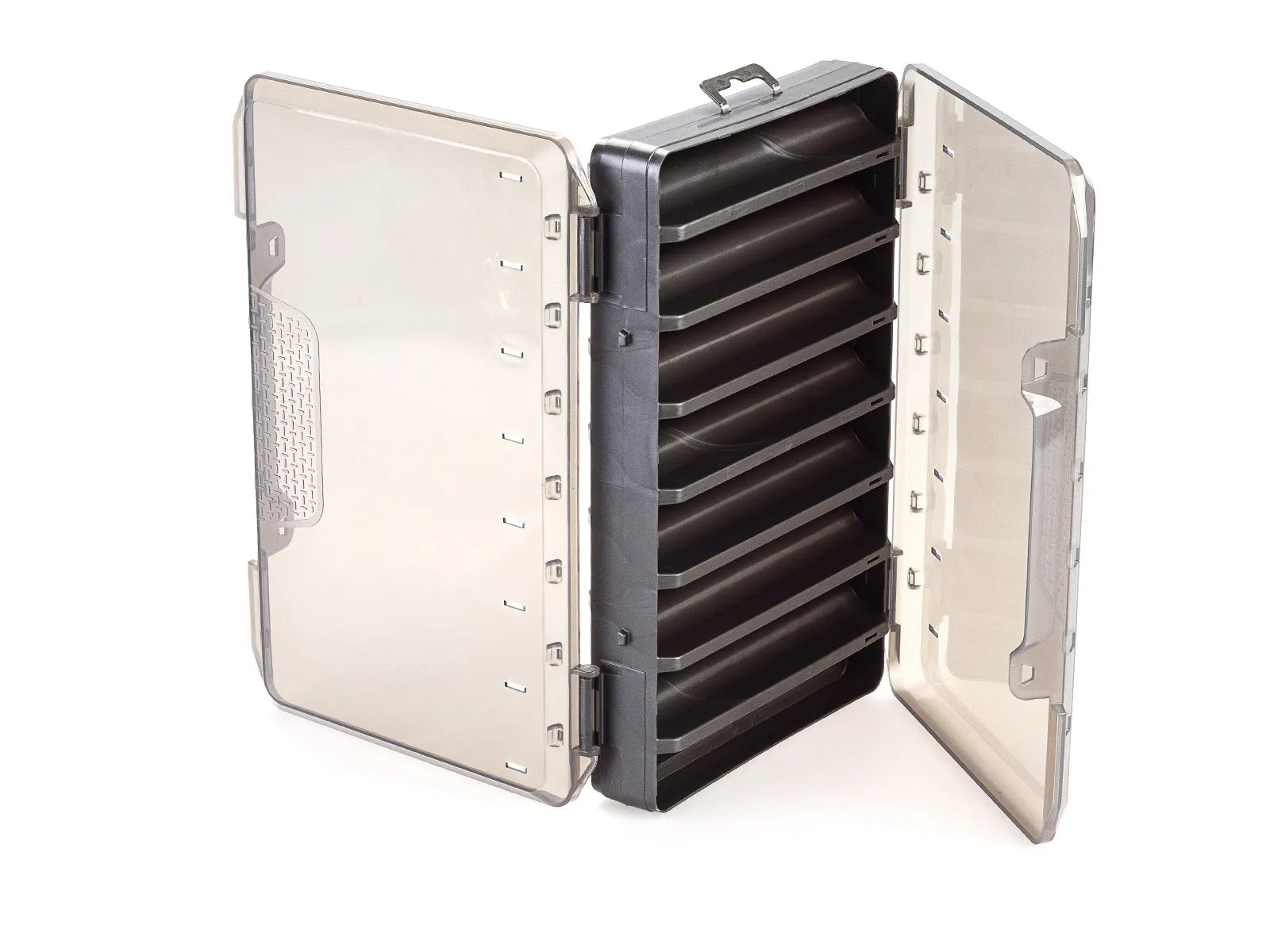 Die CAMO Lures Hardbait Box Large hat 15 v-förmige Fächer für Hardbaits (max. 15,5 cm Länge). Die Deckel sind mit kleinen Lüftungsöffnungen versehen, so dass die Wobbler problemlos in der Box trocknen. Die CAMO Lures Hardbait Box Large ist praktisch, um beim Angeln seine Twitchbaits und Minnows stets griffbereit zu haben!