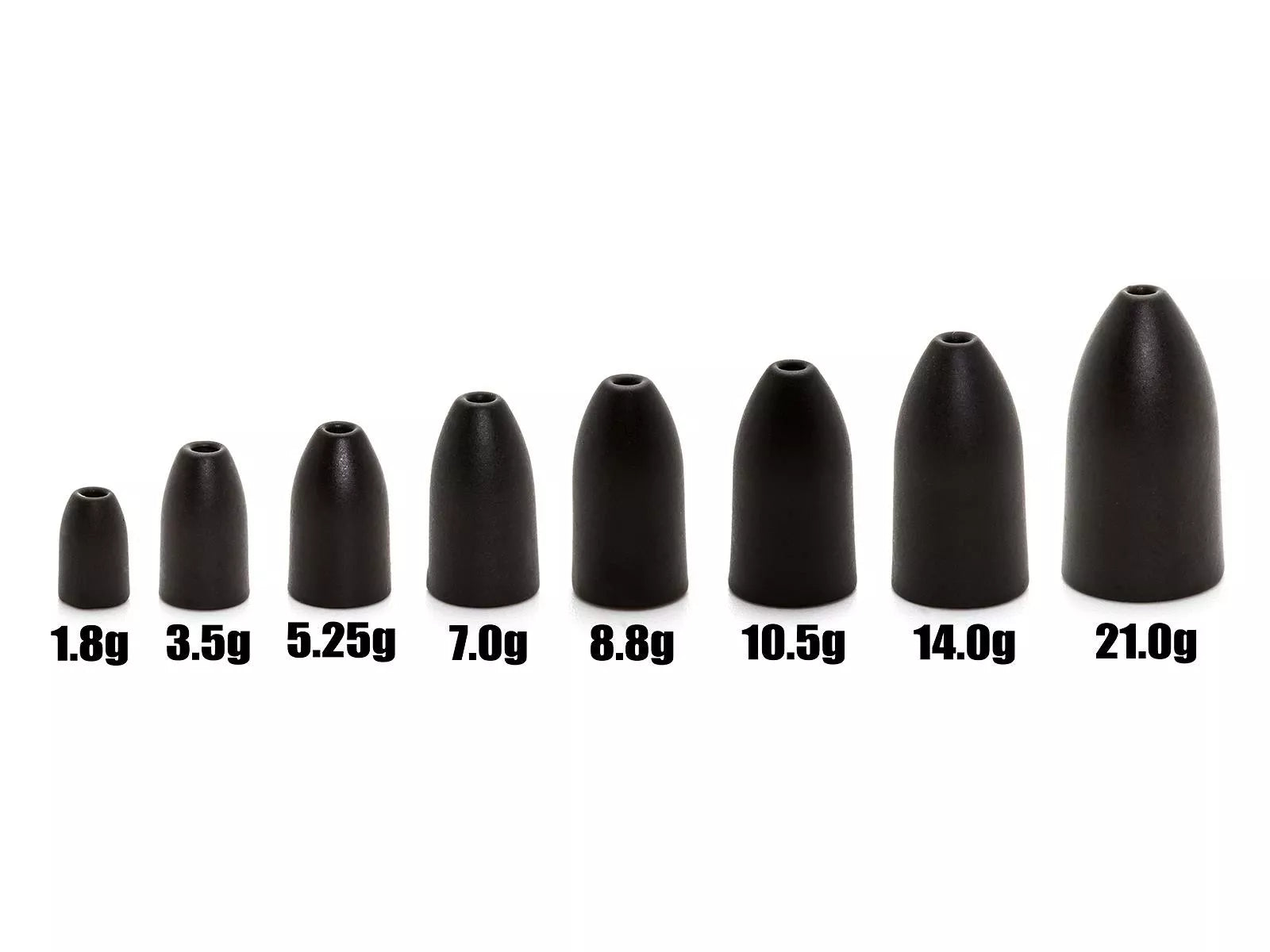 Die CAMO Tungsten Bullet Weights (BLACK) sind matt-schwarz lackierte Tungsten-Gewichte für das Texas und Carolina Rig. Die Schnurführung ist poliert, so dass das Vorfach auch bei längerem Gebrauch nicht beschädigt wird. Das Material besteht zu 98% aus Tungsten, hat eine wesentlich höhere Dichte als Blei oder Stahl, so dass die Gewichte deutlich kleiner ausfallen. Zudem überträgt das harte Material sehr gut die Bodenbeschaffenheit des Gewässers, so dass man an entsprechender Ausrüstung sehr gut spüren kann, ob man das Rig gerade über sandigen Boden, Kies, Steine, Holz oder über weichen Boden führt. Wer den Unterschied einmal gespürt hat, fischt nur noch Tungsten!